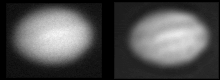 These are some preliminary results with a Maximum Entropy program I am developing in spare moments. The raw image J24 on the left was provided by Ken Irving of Salford Astronomical Society taken with an early Starlight eXpress framestore camera. Unfortunately the seeing in Salford is rarely very steady so even with short CCD exposures the results are often blurred. Deconvolution was done using a Gaussian blurring function estimated from a Galilean satellite which was faintly visible in the field of view.