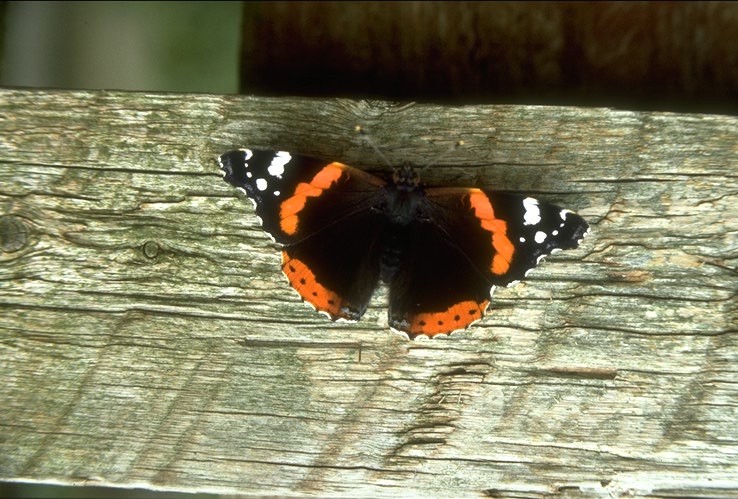 The first test image is a Red Admiral butterfly drying it's wings in strong sunlight on a wooden fence. It was taken on Kodachrome 25 with a 70-210 Pentax macro lens at f8. There is fine detail on all scales in the wood grain and the scan just caught the body texture as well as the highlights.