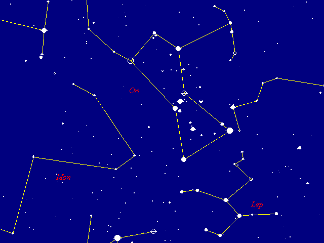 Orion 19:24UT 15/1/98 16s Kodak DC-120 (best compression) sampled to 640x480 to save time on downloading. Single hot pixels are best examined on the original 1280x960 image in uncompressed mode. If you look carefully at this original image you can find quite a few CCD hot pixel stars. You can also see more structure in the corner glow effect as radial striations and colour fringes. Fortunately they are reproducible on every exposure so they disappear when the dark frame is subtracted leaving only the real stars. All stars down to 5th magnitude are fully recorded, and it becomes more patchy in the 5.3-5.8 magnitude range with some recorded and some not (presumably a colour bias).