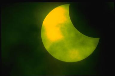 The following images were taken during the last partial eclipse visible from England and show the point of maximum obscuration by the moon. Unfortunately, the clouds were ever present and all shots were through a thin veil of high cirrus combined with some lower cumulus. The lens is a 1000mm f10 mirror lens of Russian Maksutov design used in combination with a full aperture front element solar filter and a 2x teleconverter to get optimum plate scale. The images are full frame slides on Fujichrome Sensia 100 scanned onto Kodak PCD.