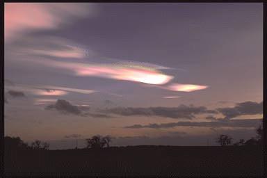 27 - 17:37 good horizon, to show cloud details and periodic structure in the cloud behind the bright colourful one. Colours are still highly developed, but hard to see on the print. The blue/purple leading edge spike of the main cloud sticks out a long way. Auto exposure -1 stop (f2 1/30) |